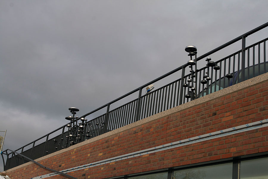 Around 900 round metal shapes, in all different sizes are growing on 26 new metal fences around the bicycle storage and the bike ramp. This creates a trace through the whole new station area near the bike lane. Originally there was a river at this side, the round shapes refer to the waterbubbles . Some fences have bells in a bigger concentration, sometimes the bars are growing in the air, or over the wall towards the ground, with the bells like flower buds growing over them. An organism seems to overtake the fence. The fence is growing on several places, which makes it less of a barrier and more sculptural.